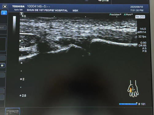 肌骨超聲作為一種高分辨率的超聲成像技術(shù),具有無(wú)創(chuàng)、實(shí)時(shí)、動(dòng)態(tài)及可重復(fù)性高等優(yōu)點(diǎn),在評(píng)估關(guān)節(jié)及周圍軟組織病變方面具有獨(dú)特優(yōu)勢(shì)。能夠清晰顯示關(guān)節(jié)囊、滑膜、肌腱、韌帶等軟組織的細(xì)微結(jié)構(gòu)。
